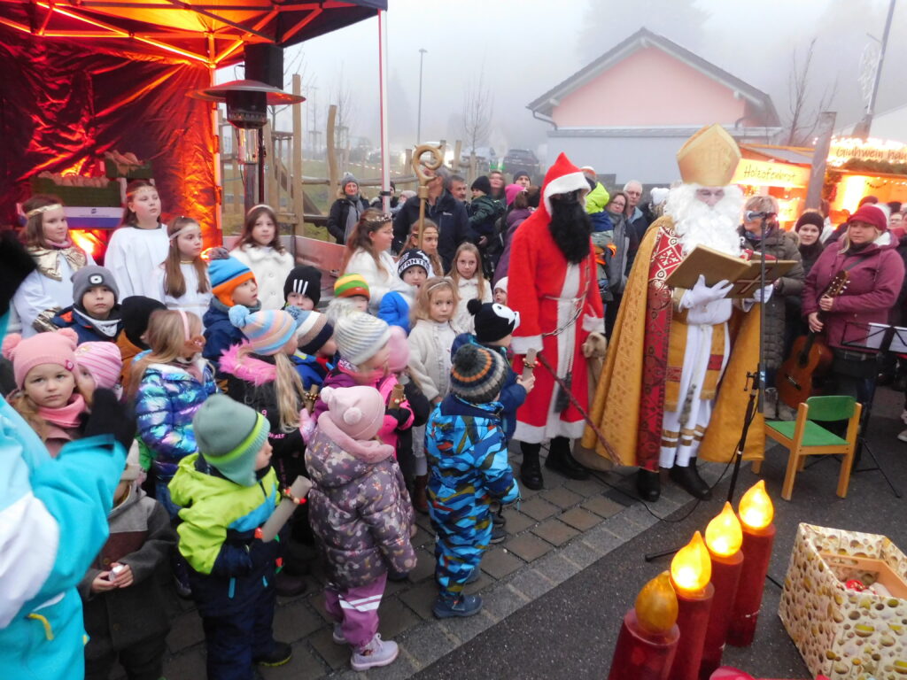 Die Kinder des Kindergartens St. Michael sangen mit Leiterin Anne Weikl und musikalischer Begleitung durch Jutta Gerg und Alex Birnböck Lieder zur Begrüßung, die vorher in wochenlangen Proben geübt worden waren. Die Kinder freuten sich auf den Besuch des Hl. Nikolaus, der schließlich mit seinem „Krampus“ auf den Dorfplatz zog und kleine Geschenke an alle Kinder verteilte, nachdem er aus seinem goldenen Buch vorgelesen hatte. Ingrid Hupf spielte auf ihrer Gitarre Weihnachtslieder und freute sich, dass auch einige Besucher mit ihren Kindern kräftig mitsangen.