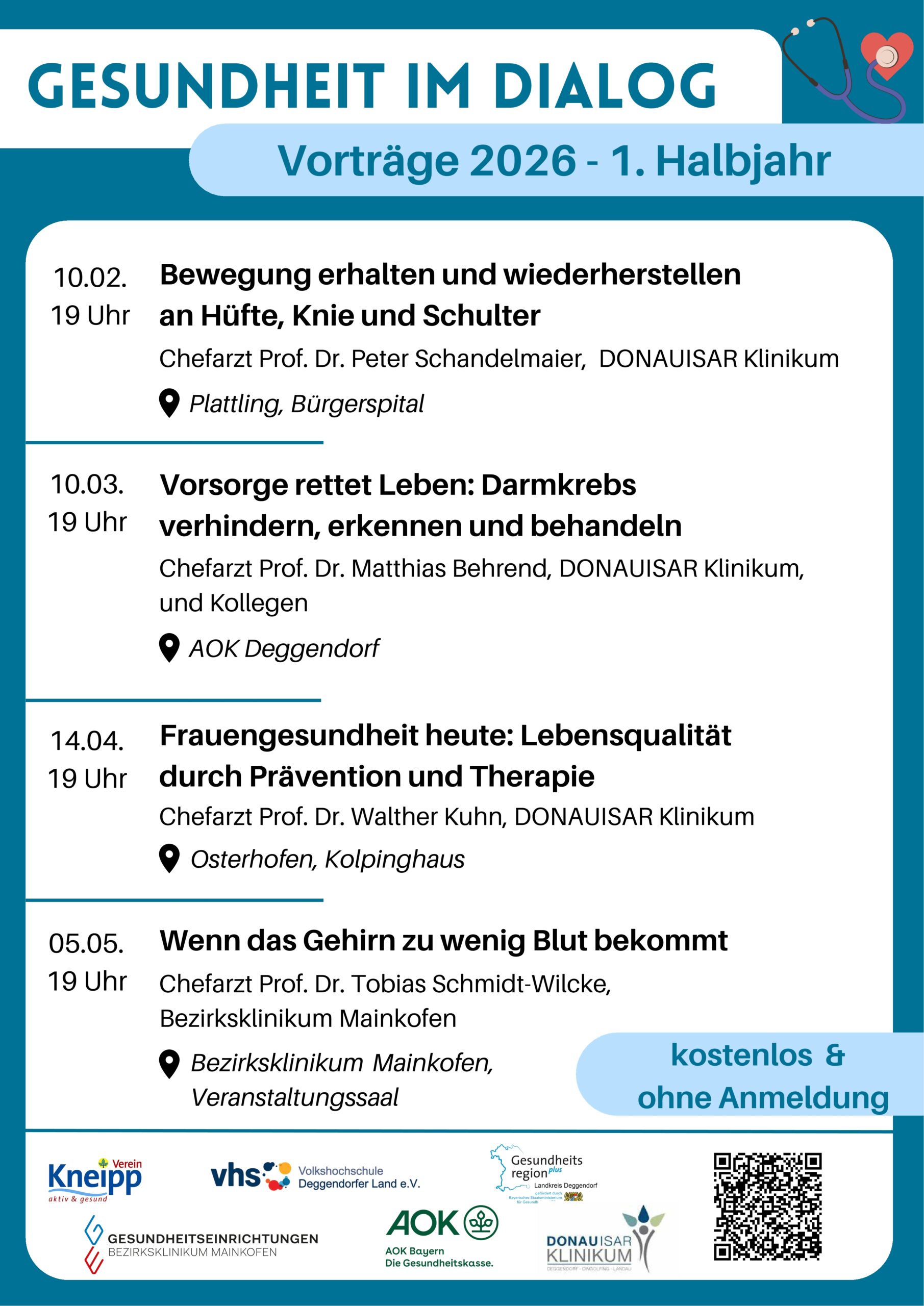Die Vortragsreihe „Gesundheit im Dialog“ ist ein gemeinsames Projekt des DonauIsar Klinikums Deggendorf, der AOK Deggendorf, der Gesundheitsregionplus Landkreis Deggendorf, des Bezirksklinikum Mainkofen, der VHS Deggendorfer Land und des Kneippvereins Deggendorf. Alle Vorträge sind kostenlos – eine Anmeldung ist nicht nötig.